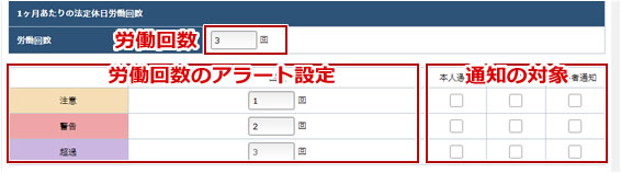 | 労働回数 | 設定した回数が1年間の 法定休日労働回数となります。 |