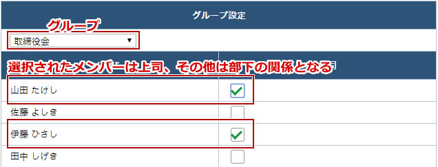 設定に使用するグループを選択し、表示されたメンバーから上司として設定する人物をチェックし、