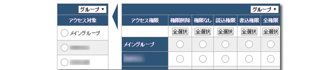 | 3. | アクセス対象を選び、欄の左側のラジオボタンをクリックします。 グループ全員をアクセス対象にしたい場合は、グループ名のラジオボタンをクリックしてください。 必ずはじめにアクセス対象を選択してからアクセス権限を指定してください。 アクセス権限を指定した後に対象を変更すると指定したアクセス権限は保存されません。 |