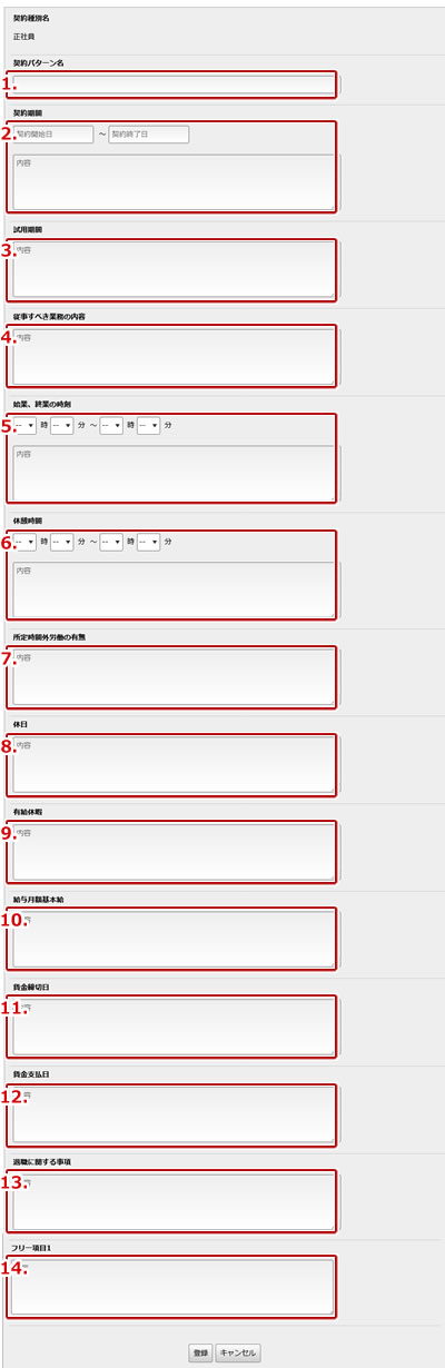 | 14. | 契約種別で設定したフリー項目の内容を入力します。 |
