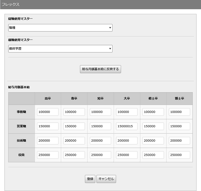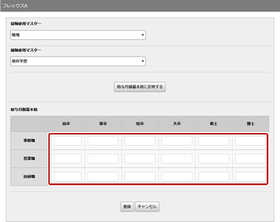 クリックすると、その下の「給与月額基本給」に選択したマスターを反映した給与月額基本給の設定欄が