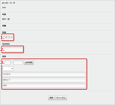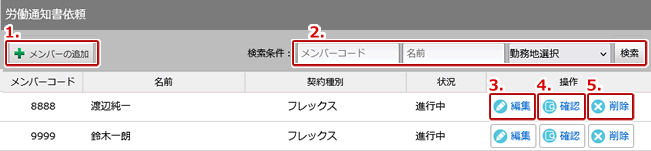 【メンバーコード】メンバーコードで絞り込みます。 【名前】社員の名前で絞り込みます。 【勤務地選択】社員の勤務地で絞り込みます。 |