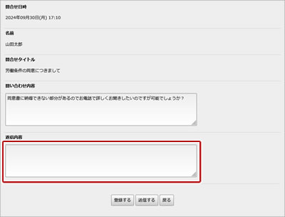 | 3. | 【返信無】問合せ内容の確認、編集、送信ができます。