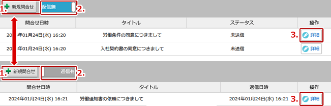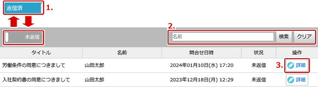 | 1. | 問合せのリスト表示を「未返信」「返信済」で切り替えられます。 |