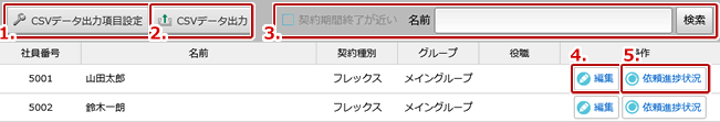 【契約期間終了が近い】チェックを入れて検索すると契約期間終了が近い社員が表示されます。 【名前】社員の名前で絞り込みます。 |