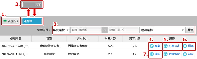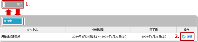 | 2. | 依頼のリスト表示を「進行中」「完了」で切り替えられます。 |