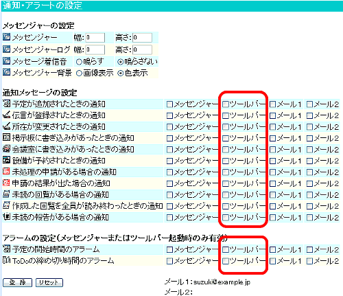 | 3.ツールバーの項目で通知の必要な項目をチェックし、最後に登録ボタンをクリックします。 |