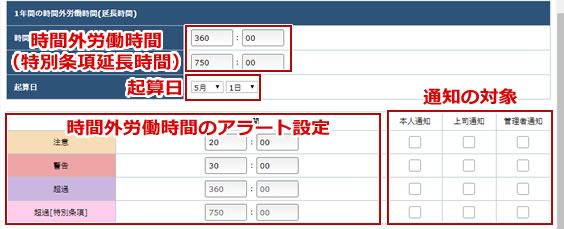 | 特別条項延長時間 | 設定した時間が1年間の 総合した特別条項延長時間となります。 |