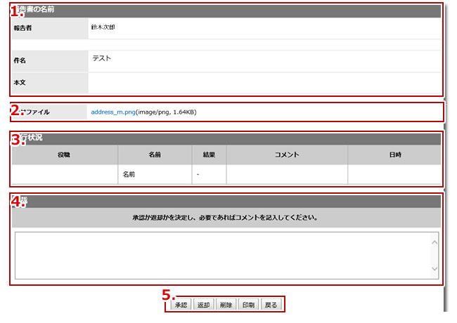| 5. | 報告書を各ボタンで操作します。 承認…報告書を承認します 返却…報告書を返却します 削除…報告書を削除します 印刷…報告書を印刷するための画面を表示します 戻る…前の画面に戻ります |