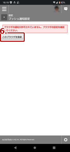 6. プッシュ通知設定画面( [設定] > ▽を押す > [通知の設定] > [プッシュ通知設定] )を開き、「このブラウザを登録」