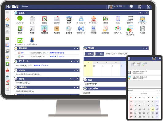 スケジュール管理、掲示板、ファイル共有、ワークフロー、メール、電話メモ、ToDoリスト、報告書、アドレス帳、プロジェクト、ToDoリスト、タイムカード