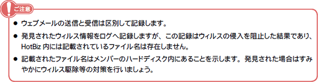 | 「ウェブメール」「掲示板」「会議室」「キャビネット」「ワークフロー」「回覧板」の各機能で行われたウィルスチェックのログを残します。ウィルスチェックオプションをご契約後の初期状態では、ログを残さない・メールでは知らせないとなります。必要に応じて以下の手順に従い設定してください。 | |